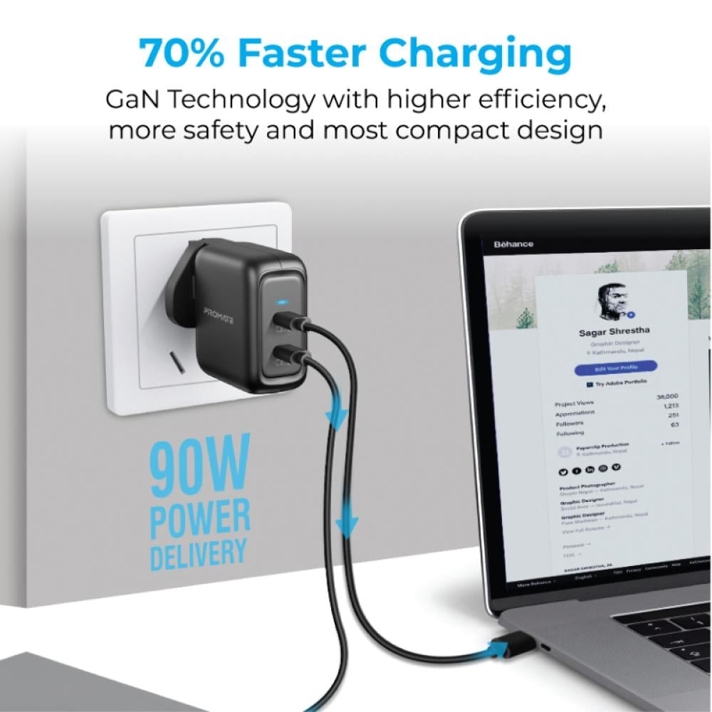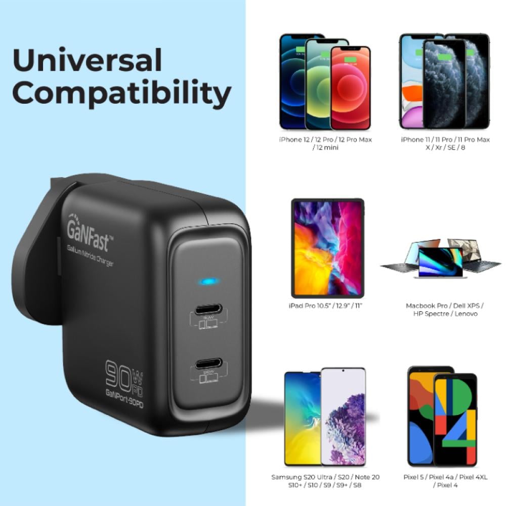 يستخدم GaNPort-90PD تقنية GaNFast (نتريد الغاليوم) الجيل الجديد لتقليل الحجم وزيادة نقل الطاقة، مما يتيح شحن جهازين في نفس الوقت - من سماعات الأذن إلى الهواتف، والأجهزة اللوحية، وأجهزة الكمبيوتر المحمولة.
